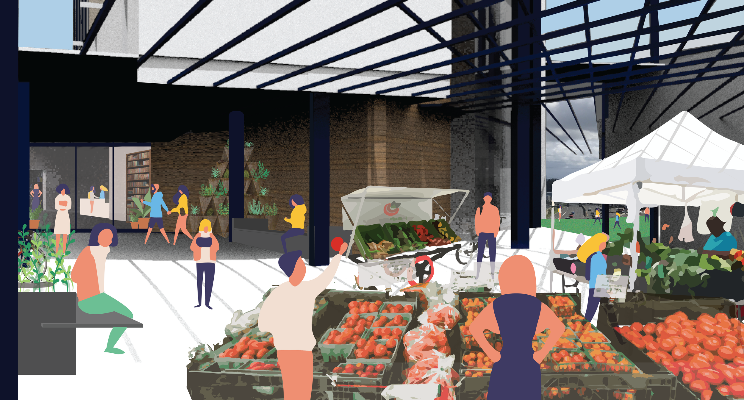The building’s central arcade will be a flexible event space and serve as an exciting entry to the Atrium BKLYN community library and green space. Shown Here: Farmers Market in building’s arcade with library entry to the left.