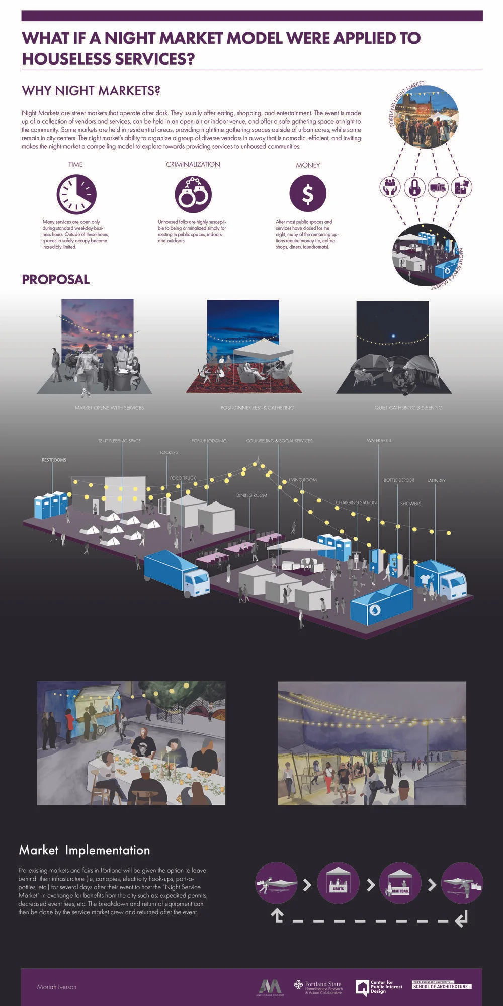 Night Markets are street markets that operate after dark. They usually offer eating, shopping, and entertainment. The even is made up of a collection of vendors and services, can be held in an open-air or indoor venue, and offer a safe gathering space at night to the community. Some markets are held in residential areas, providing nighttime gathering spaces outside of urban cores, while some remain in city centers. The night market’s ability to organize a group of diverse vendors in a way that is nomadic, efficient, and inviting makes the night market a compelling model to explore towards providing services to unhoused communities.