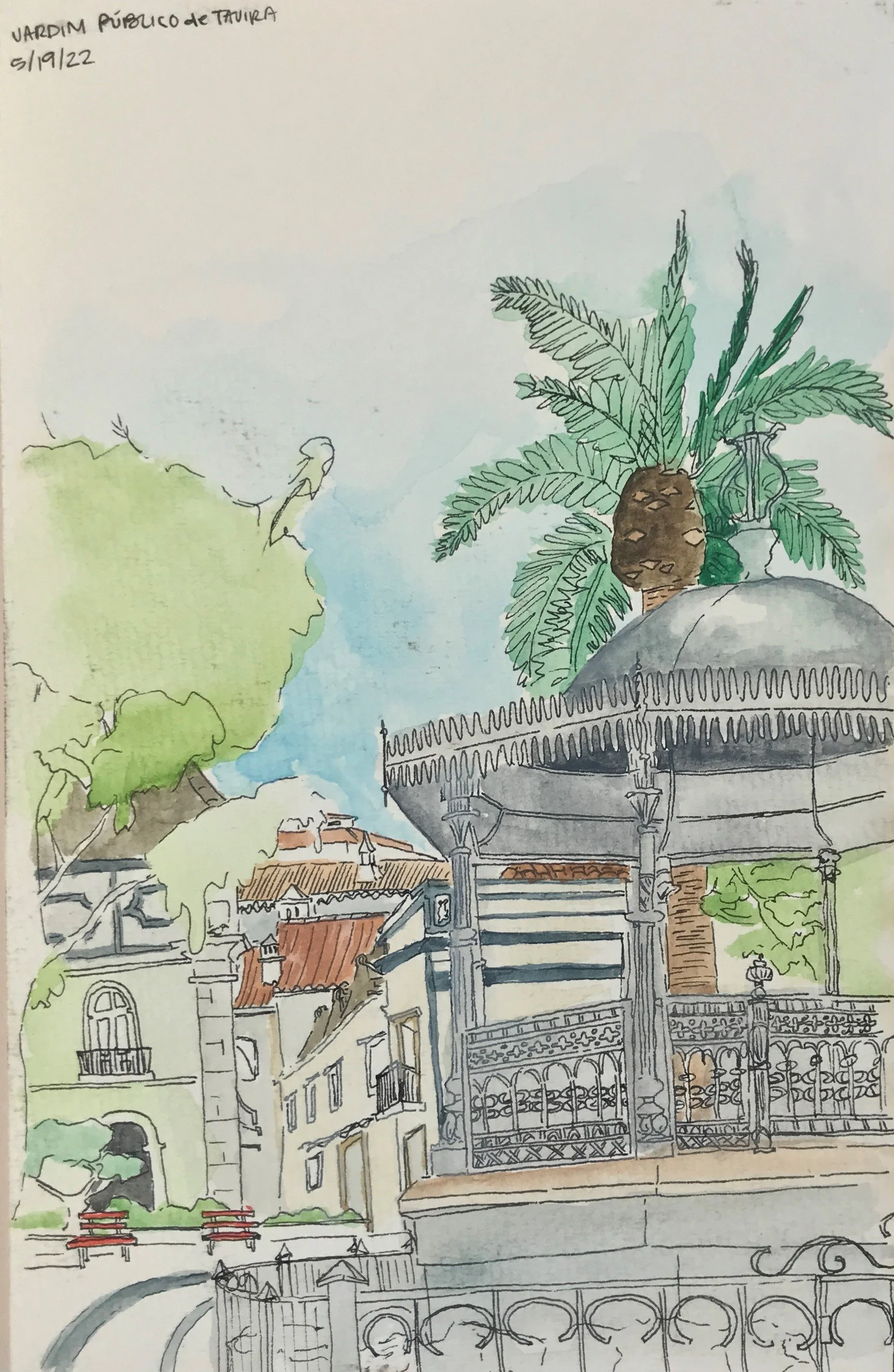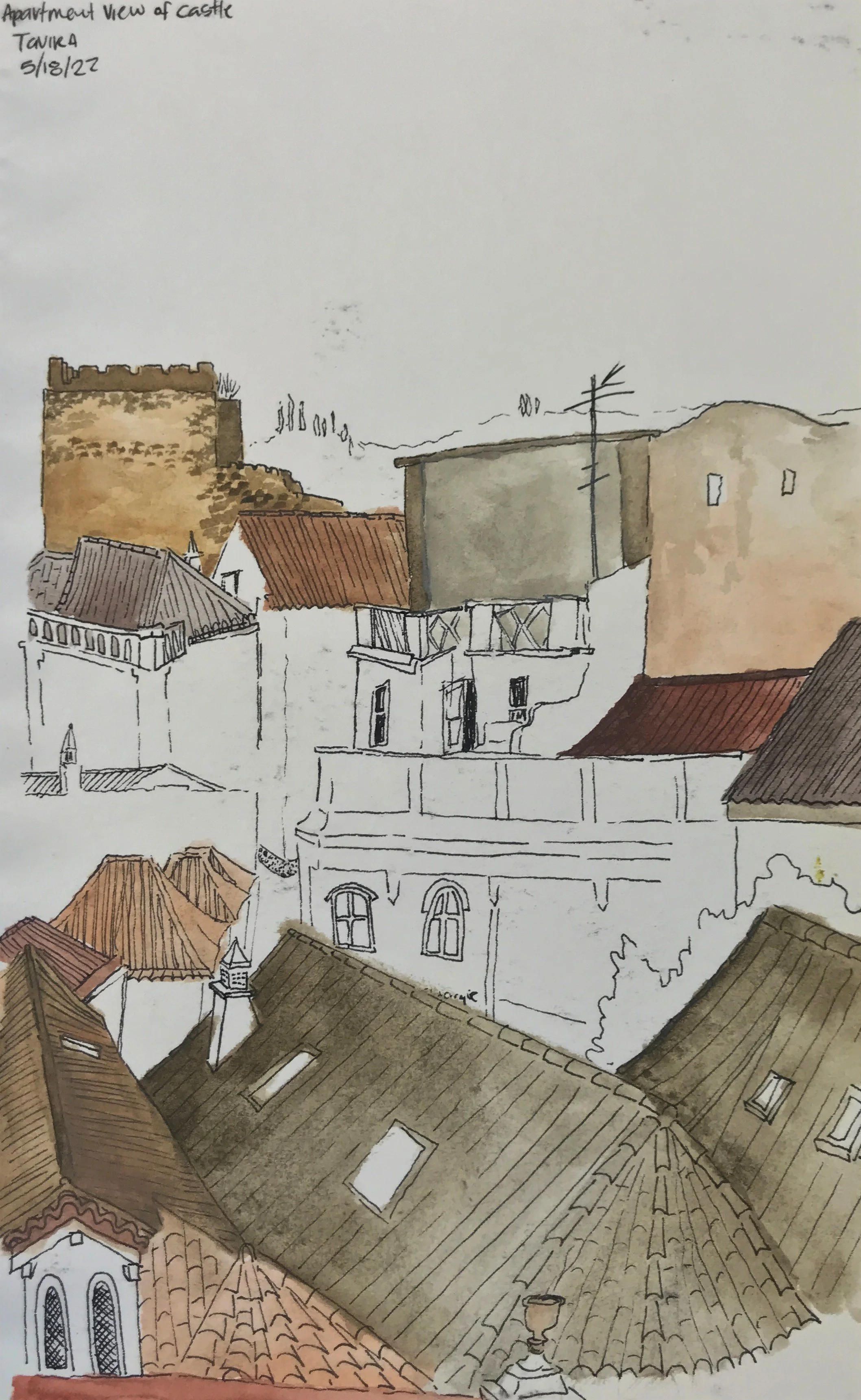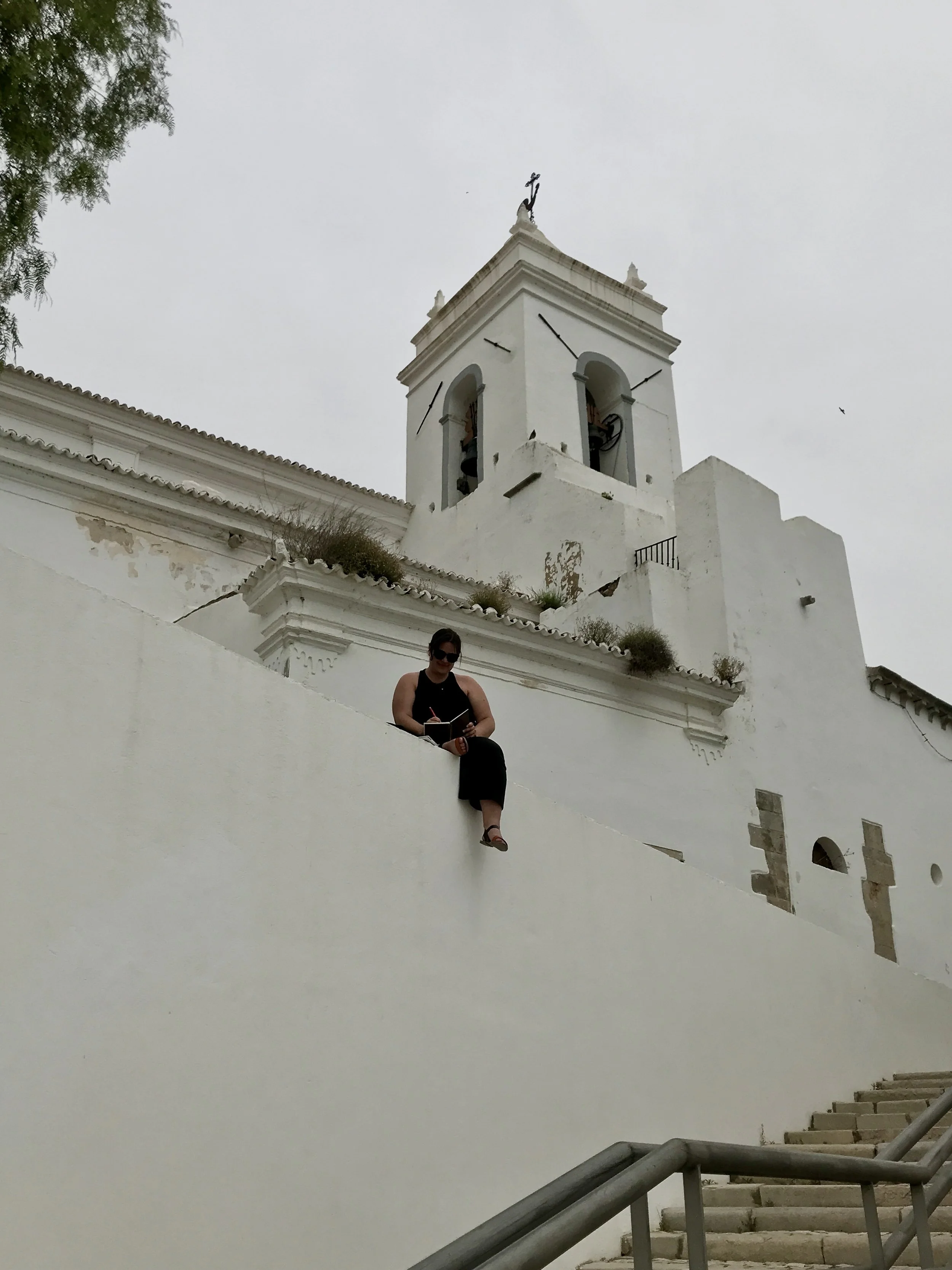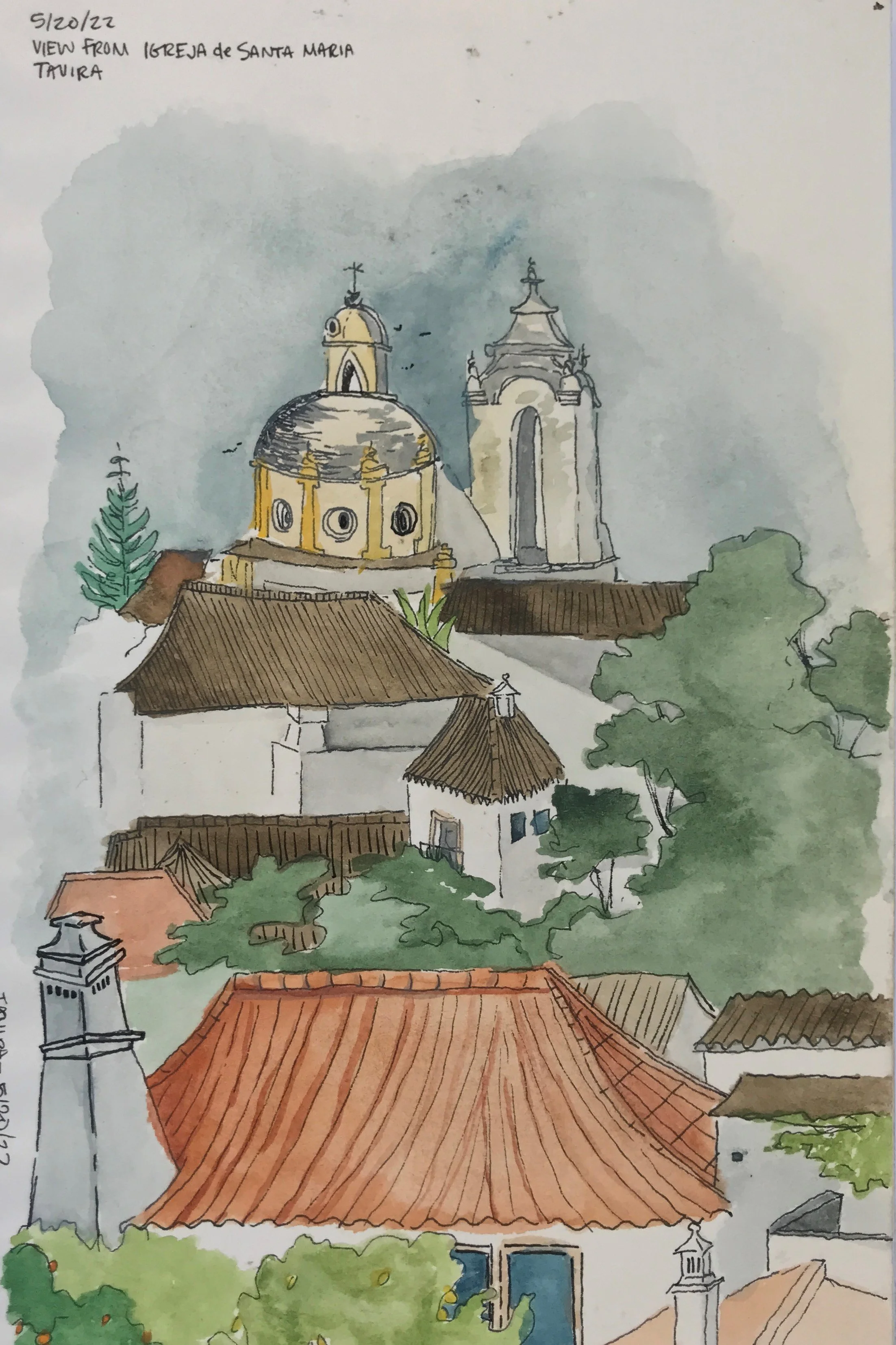 Painting while perched on a wall of Santa Maria do Castelo church in Tavira, Portugal [finished painting to the right]