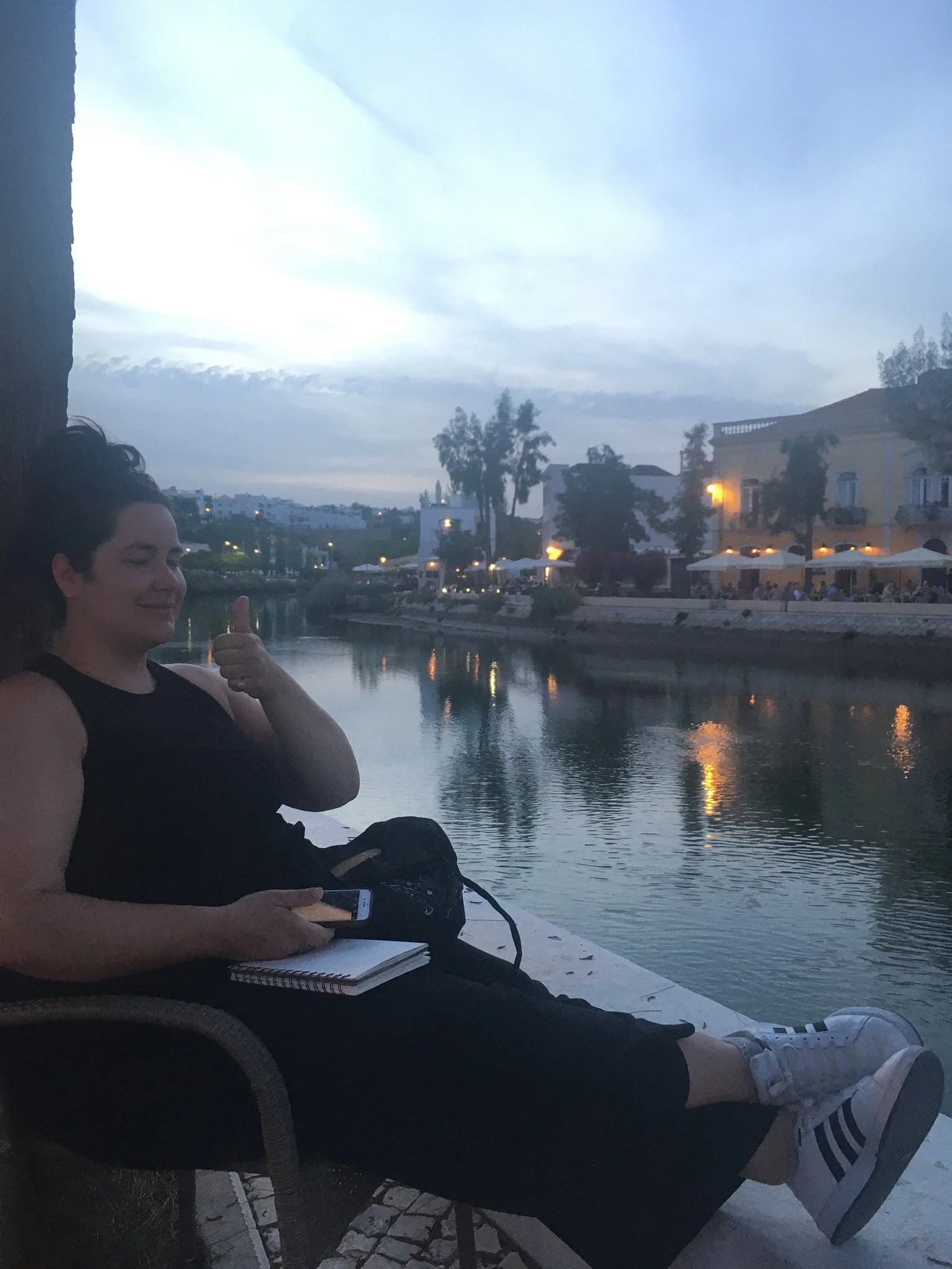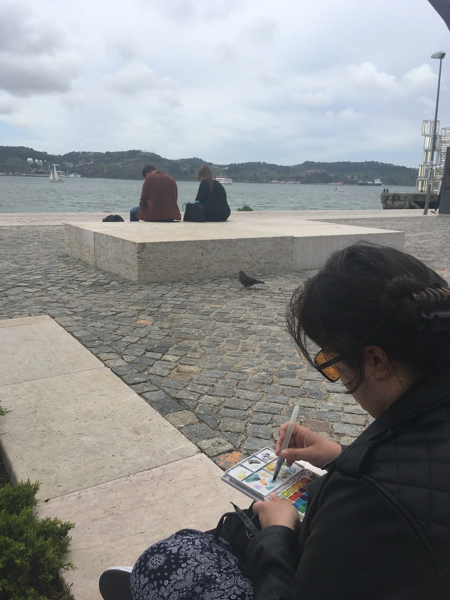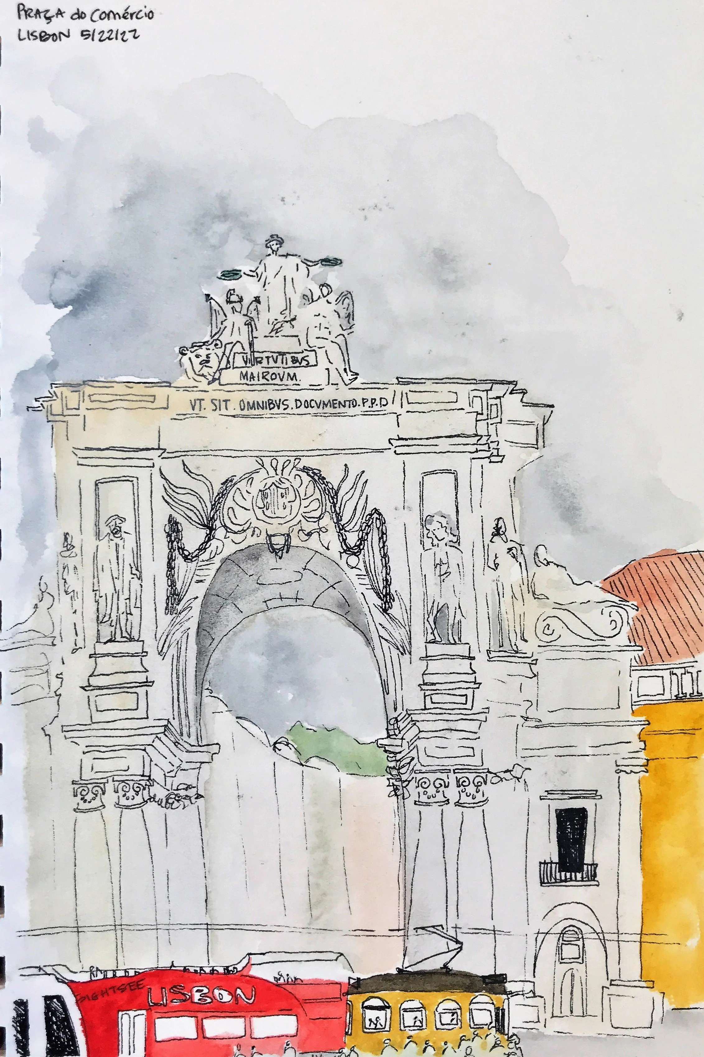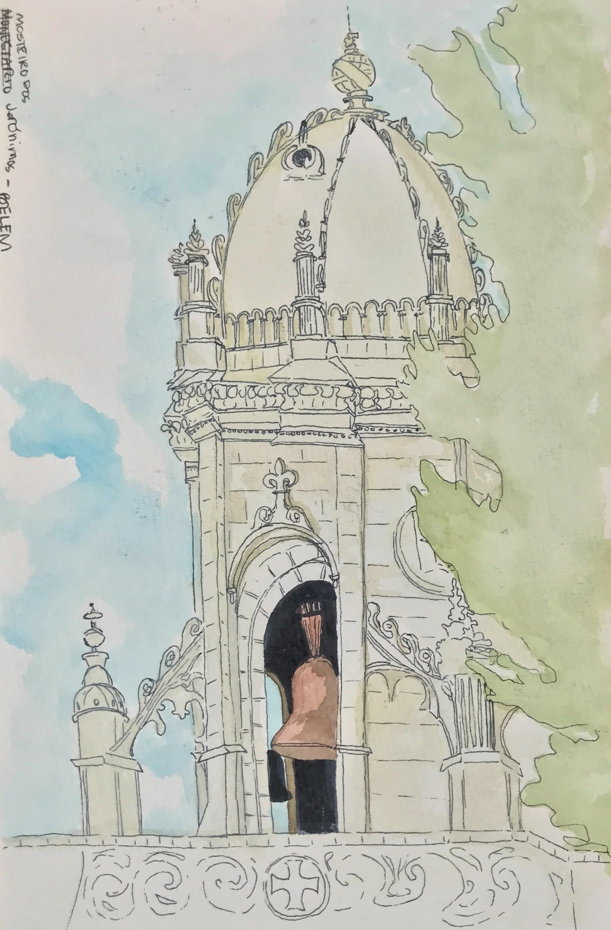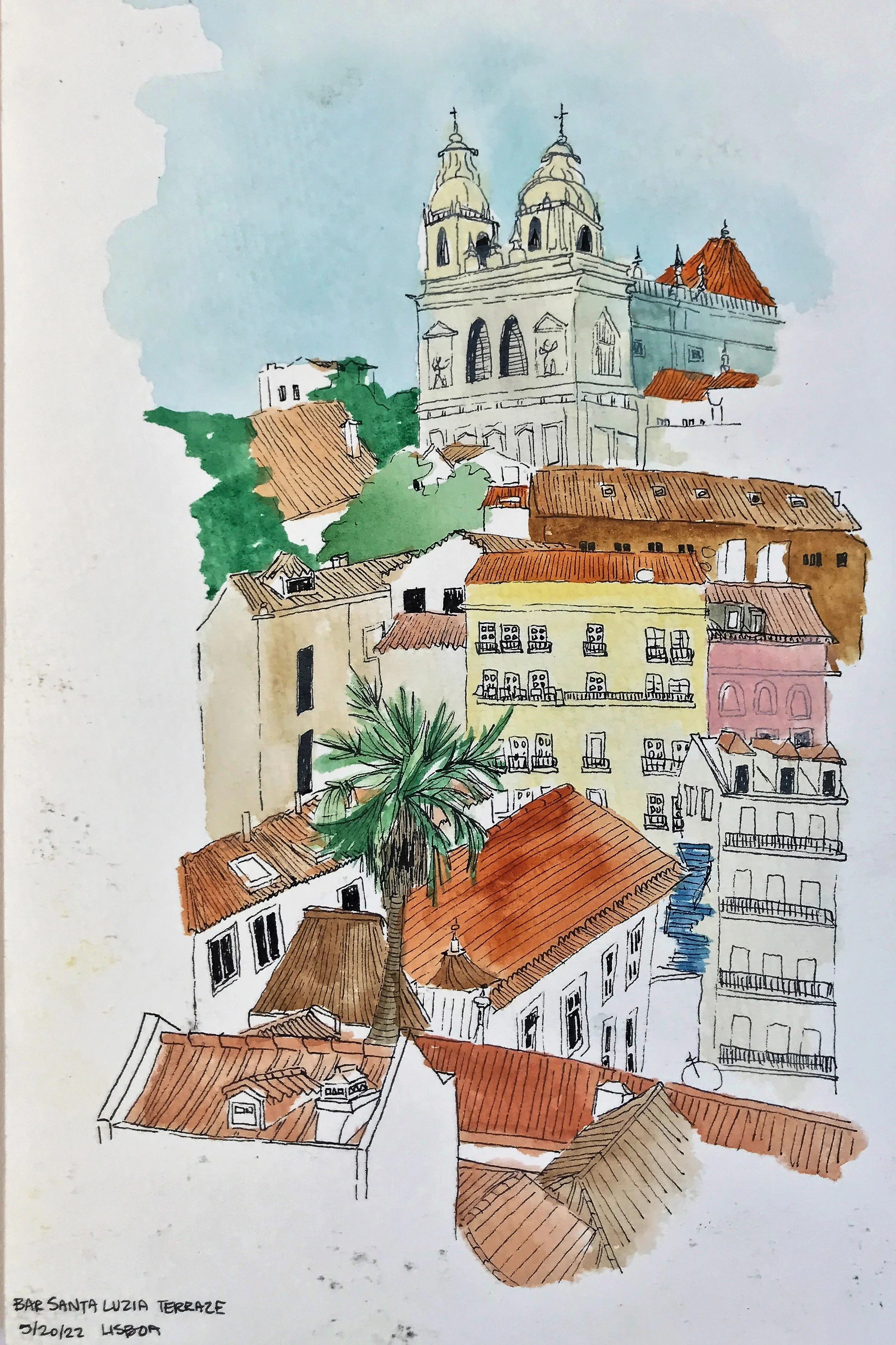 Painting while perched on a wall of Santa Maria do Castelo church in Tavira, Portugal [finished painting to the right]