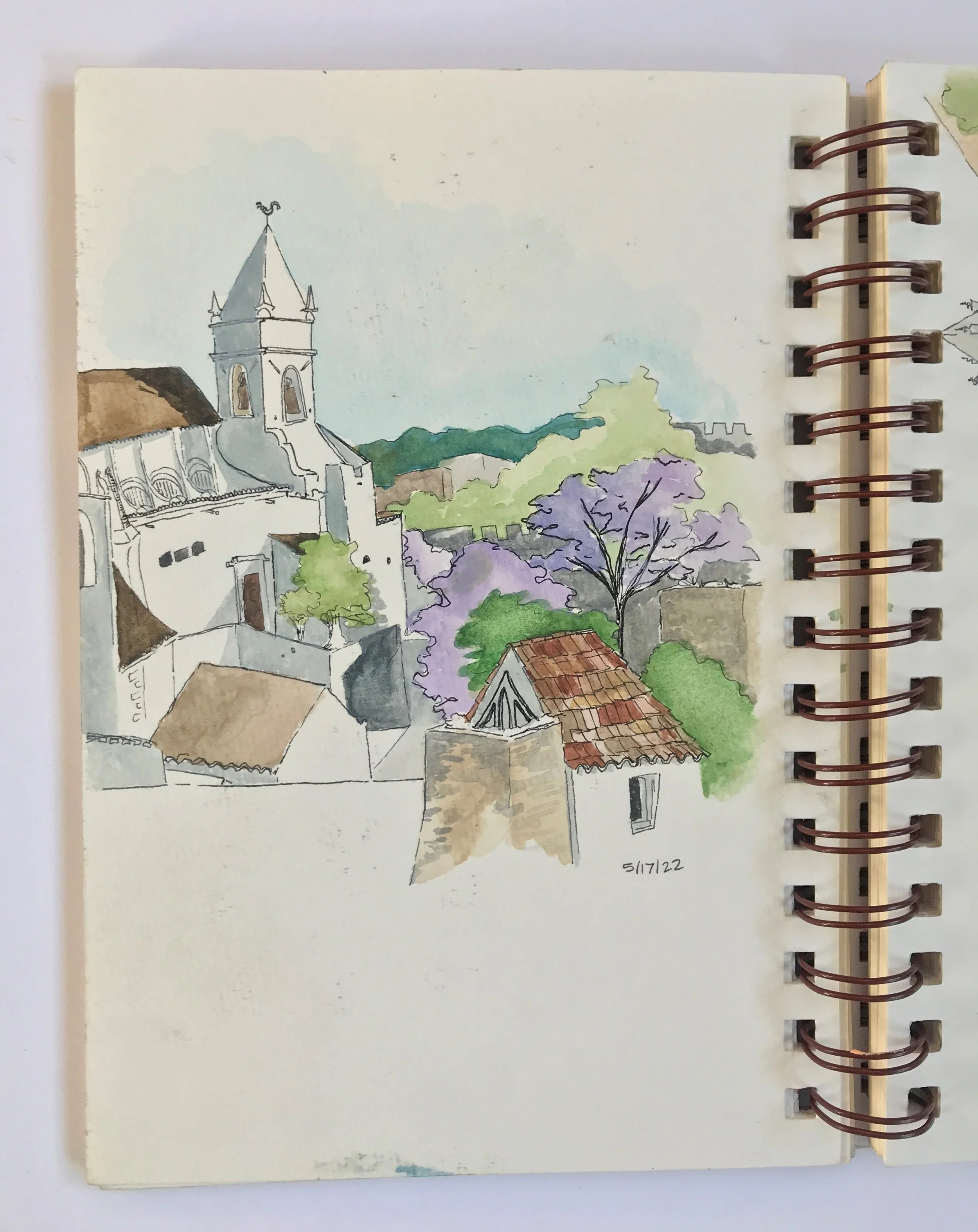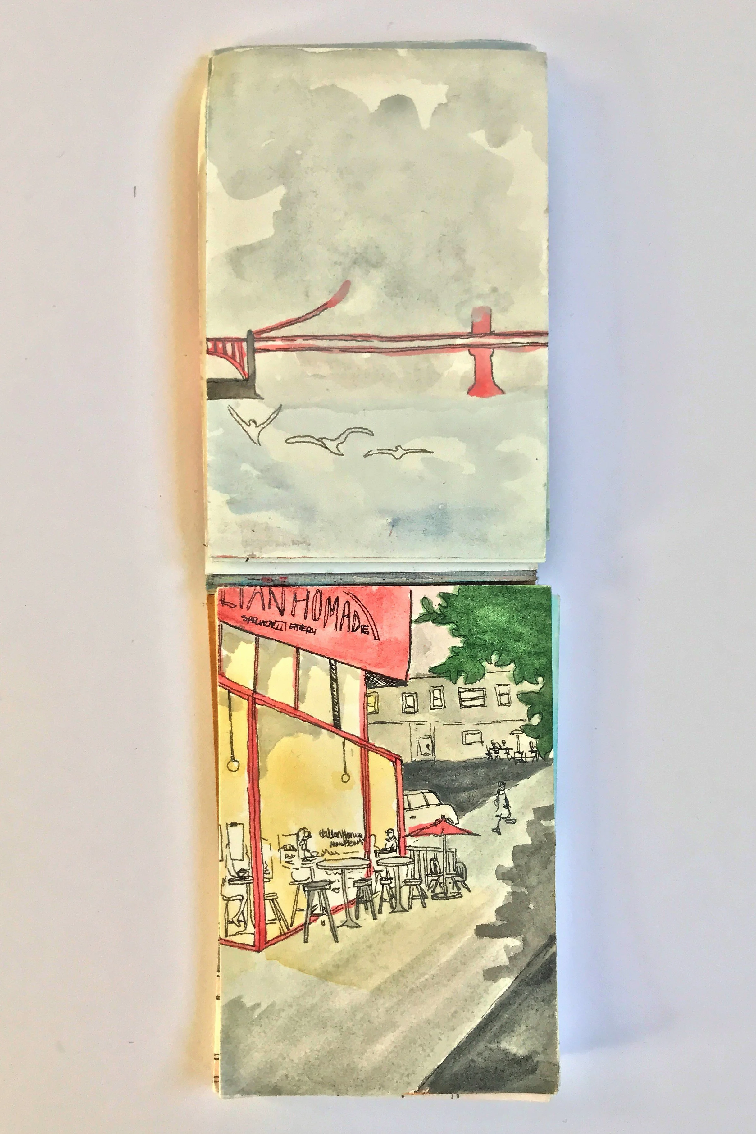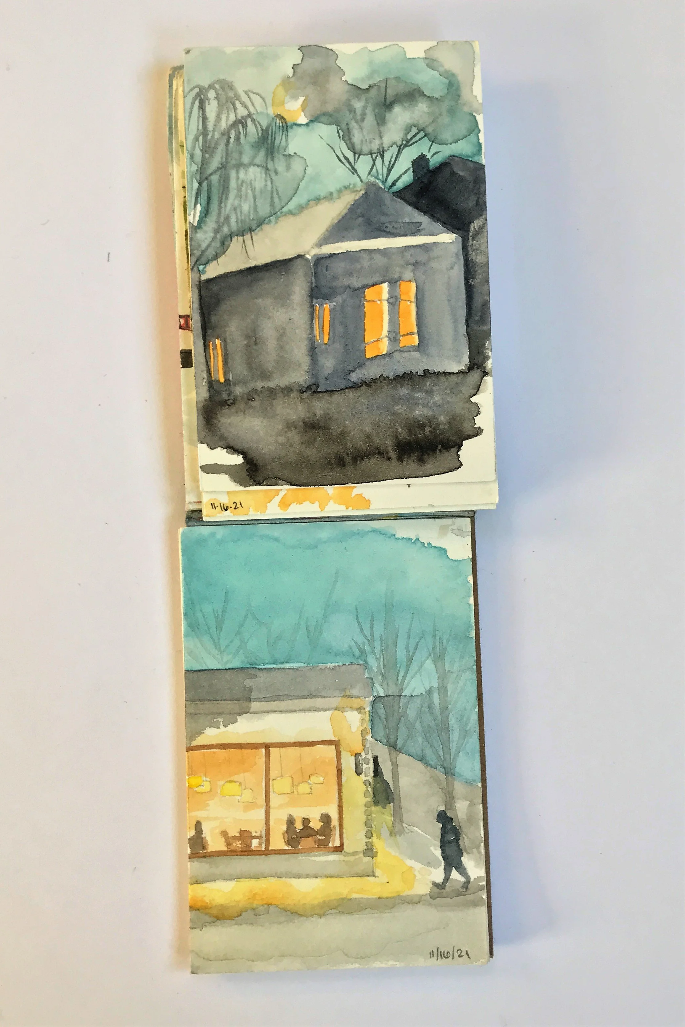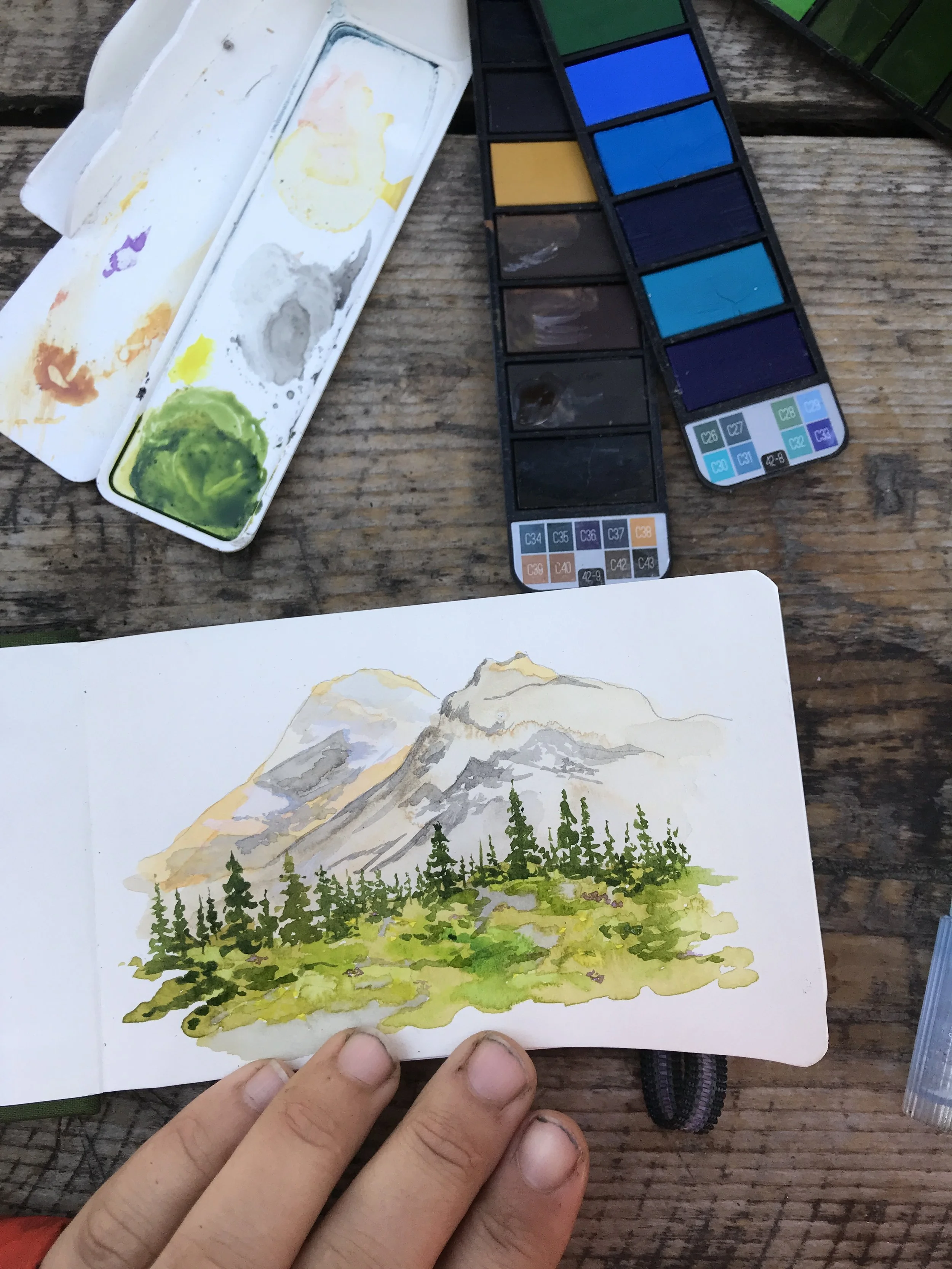 When painting with watercolor, I almost exclusive paint “en plein air” wherever, whenever. Throughout long hikes, during walks in my neighborhood, and on many modes of transportation. All of the paintings here were done on-the-go, outside of my studio.