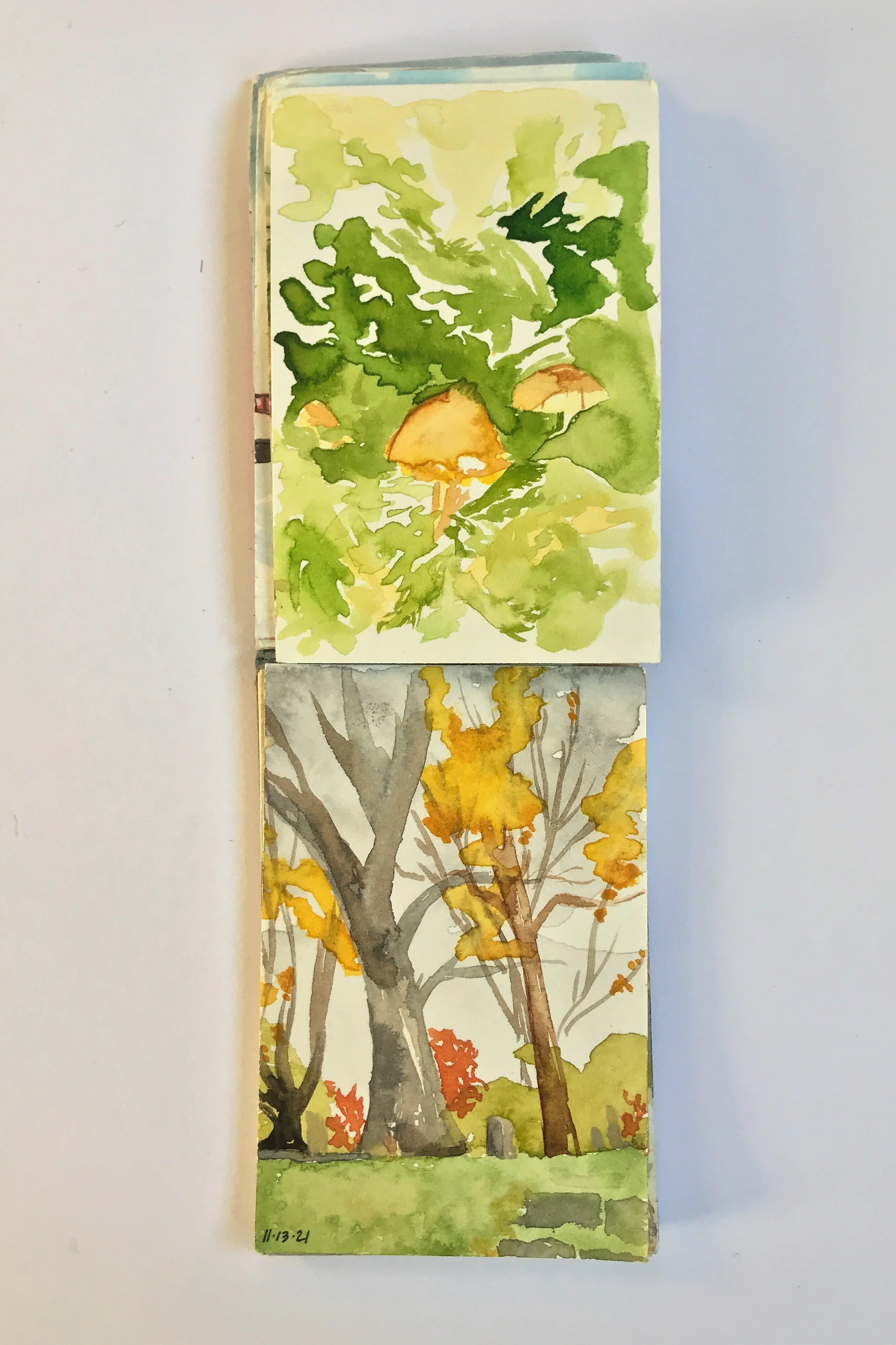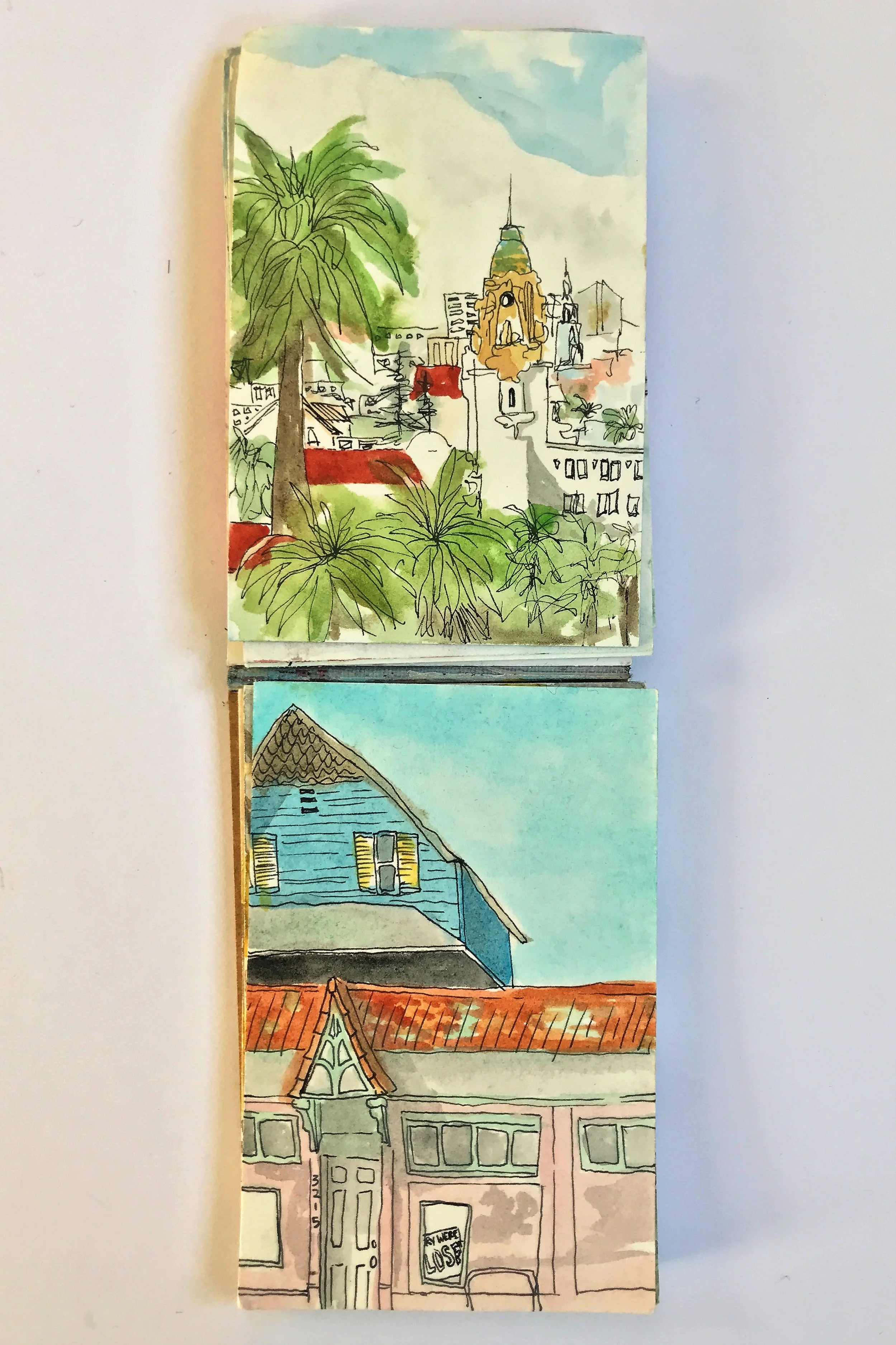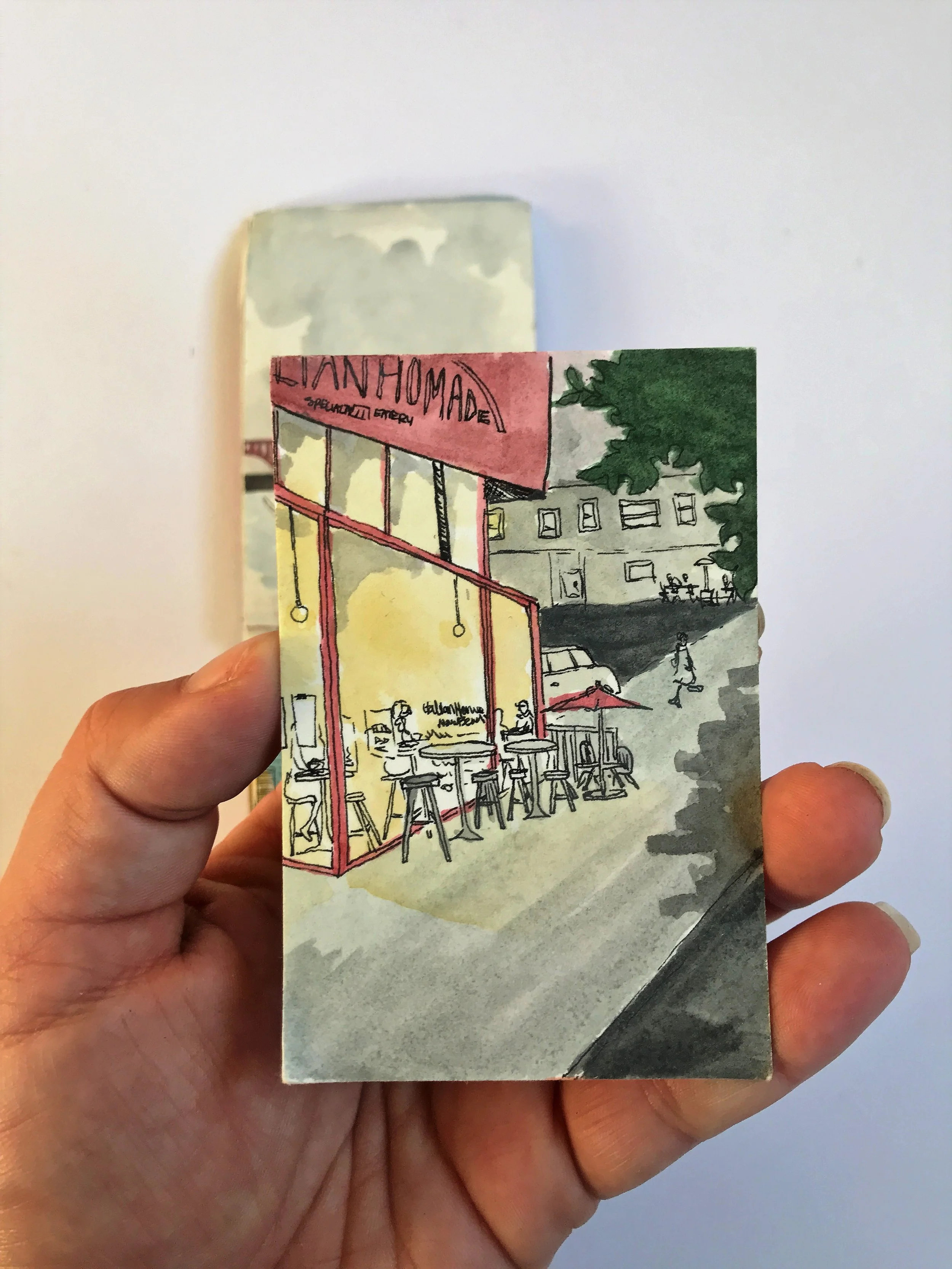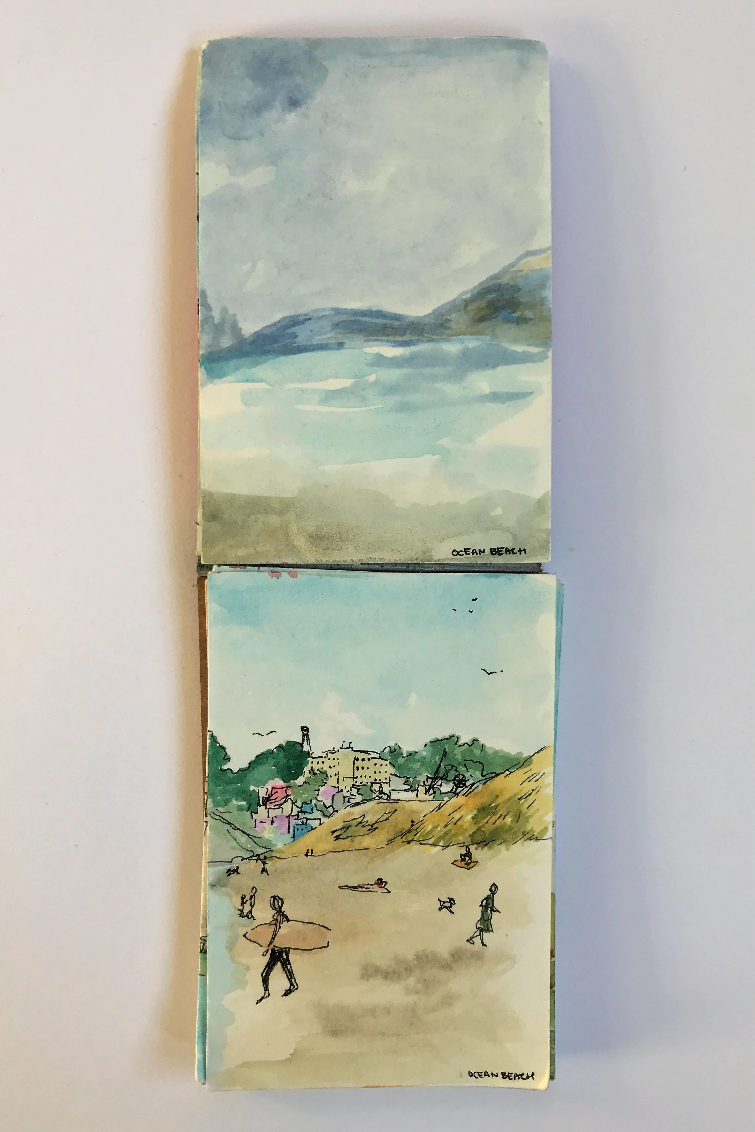 When painting with watercolor, I almost exclusive paint “en plein air” wherever, whenever. Throughout long hikes, during walks in my neighborhood, and on many modes of transportation. All of the paintings here were done on-the-go, outside of my studio.